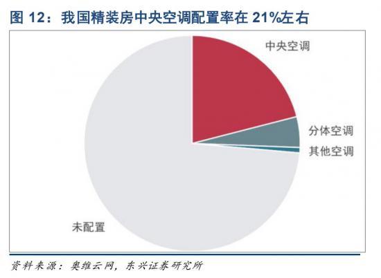 奥维云网数据统计,我国空调的精装配套率为26.4%,中央空调配套率为21%。2018年在房地产排名前50的房企中,精装配套率为21.9%,非前50的房企配套率为35.5%。