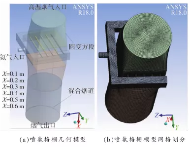 图 1 SCR 喷氨格栅几何模型及网格划分