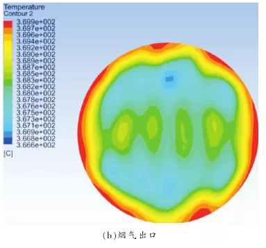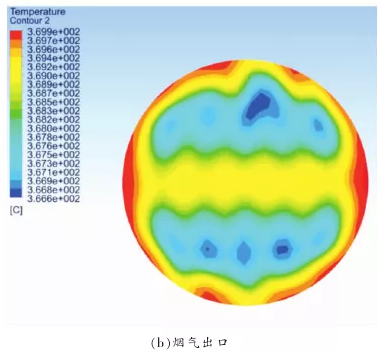 图 6 为优化后喷氨格栅的温度分布, 其温度标尺和图 3 原始喷氨格栅的温度标尺保持一致。喷氨入口截面的温度分布如图 6(a)所示,氨气风道的温度较低,方形段烟道的温度较高, 这同样是由于氨气和空气的初始温度不一致。5 根喷氨圆管在方形烟道内温度稍微升高了一点, 最高温升不超过 30 ℃,并未出现 原始结构 两 侧 到 中 间 温 度 明 显 升 高 的 现象。烟气出口温度分布如图 6(b)所示,虽然出口还存在小范围的局部低温区, 但总体上看其温度分布还是比较均匀, 相比较于原始喷氨格栅出口的温度分布,局部低温区范围大大较小,温度均匀性明显提升。