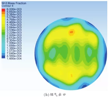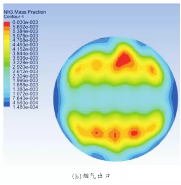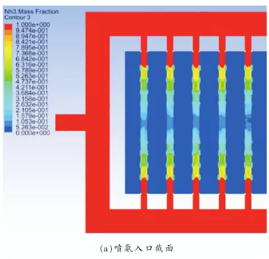 图 4 为原始喷氨格栅的 NH3质量分数分布,喷氨入口截面的 NH3质量分数分布如图 4(a)所示,氨气风道的 NH3质量分数分布为 1,方形段烟道的为 0。5 根喷氨圆管均出现两侧到中间,NH3质量分数分布逐渐降低的现象。而模拟过程中只有 NH3和空气两种组分,这说明随着 NH3在喷氨圆管中流动,方形烟道中部分空气通过喷氨孔进入到圆管中。烟气出口NH3质量分数分布如图 4(b)所示,总体上看出口NH3的分布并不十分均匀,存在中间浓度低,两侧浓度高的现象。