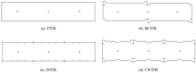 (后续简称P型板)、BE型板、M型板、CW型板几种电除尘器几何模型。三种模型尺寸均为500mm×100mm,电极线采用半径2mm的圆柱形电极,均为三线式布置。三根电极线在图中坐标(X,Y)分别为:(83.3mm,0)、(250mm,0)、(416.6mm,0)。相较于平行板,其它类型的极板的板面场强分布和板面电流分布比较均匀,能够在流场内使气流紧缩和气流扩大,进而影响离子风涡旋对流场扰动的强弱,同时其它极板内的凹槽较P型板更容易捕集一些沿气流方向运动的粉尘,从而提高电除尘器的除尘效率。本文数值计算选取的的参数值为:空气粘度μ=1.789×10-5kg/(m·s);空气中离子迁移率K=2.2×10-4m2/(v·s);离子扩散系数D=5.3×10-5m2/s。