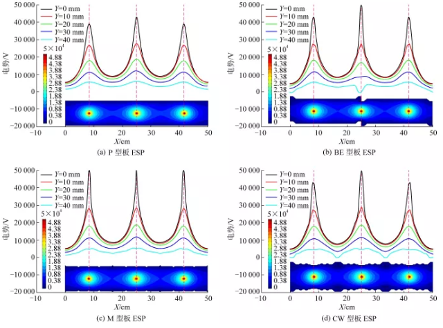 图2电压50kV时,三种板型电除尘器内的电势分布,通过在从电极线位置开始Y方向Y=0、10、20、30、40mm提取数据点,绘制分布图。在图2中可以看出,除尘器内部电势分布不均匀,但三种板型下的等势线均以电极线为中心呈椭圆状向外扩散,电势向收尘极板方向变化速度更大。在入口到出口过程中电势分布在电极线处达到峰值,电极线与电极线之间有一低谷。由于收尘极板形状不同,内部电势分布略有差异;由图2可以看出电势波动变化最为明显的是BE型板,然后是CW型板、M型板和P型板。因为不均匀的电场分布更有利于除尘效率的提高,而由图4可以对不同极板不均匀程度作比较,可以看出BE板>CW型板>M型板>P型板。电势分布有差异说明了收尘极板形状对电势分布有影响,但随着趋近电极线,不同收尘极板板型对电势分布的影响减弱。