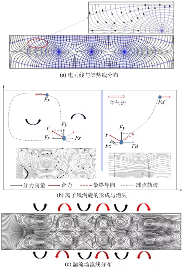 图3(b)绘制了假设球点的受力运动轨迹与离子风涡旋形成与消散示意图,图3(c)为在电压20kV,入口风速0.05m/s时P型板电除尘器内湍流流线图,并标出了涡旋流线方向,以旋转箭头表示。线板式静电除尘器中一定数量的收尘极板相互之间排列组成除尘通道,板型的变化会对通道离子风涡旋产生影响。