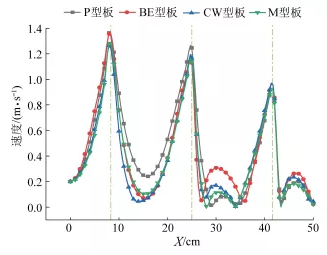 图5为相同条件下,四种板型在Y=0mm处沿X方向的速度分布对比。由图5可以看出,在Y=0mm,主气流速度为0.2m/s时沿气流方向从入口到出口过程中四种板型除尘器内速度变化幅度规律基本相似,速度变化均呈波浪状曲线分布,在两根电极线之间存在速度低谷。而各极板速度的峰值都在极线处,四种极板在电极线附近最大值分布的规律是:第一根>第二根>第三根。可以看出速度大小随X轴波动变化大小的排序是:BE型板>CW型板>M型板>P型板,另外三种板型波动大于P型板的原因是,它们的形状不规则,有些地方通道窄,有些地方通道宽,这样更有利于颗粒物的捕集。由图中第二根和第三根极线之间的波动和第三根后的波动可以看出,这两个波动的最高点都是处于上下两个离子风旋涡的交汇处,波动大小总体上BE板>CW型板>M型板>P型板,这也代表了离子风的强弱,波动大的板型离子风效应更强,主气流对其的影响更弱。