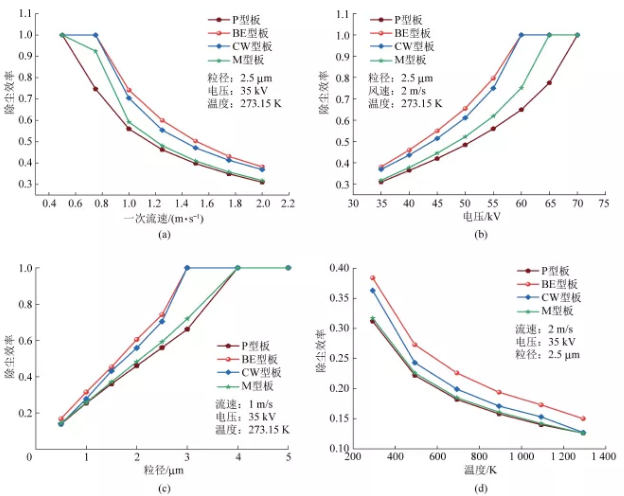 除尘效率是判断一个电除尘器性能优劣的主要标准,电除尘器的颗粒物捕集效率受到很多因素的影响。图6是利用数值软件COMSOLMul⁃tiphysics和控制变量法模拟的P型板、BE型板、CW型板和M型板在不同一次风速、不同电压、不同粒径和不同温度下的除尘效率的对比。图6表明不同极板随着一次风速的降低、放电极电压的升高、颗粒物粒径的增大和温度的降低,它们的除尘效率随之升高,同时它们的增长率也是随之升高。不同工况下不同极板的除尘效率作比较:BE型板>CW型板>M型板>P型板,根据前文总结,这是因为不均匀的电场分布、速度大小随X轴波动变化大以及较强的离子风涡旋更有利于粒子的捕集。
