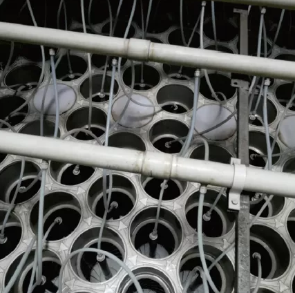 在脱硫反应过程中,石膏的生成需要鼓入氧化空气对中间产物进行强制氧化。由于氧化风机.html'>风机鼓入的氧化空气温度较高,如果对氧化空气不进行降温,塔内与浆液接触的氧化空气长时间处于高温,会在氧化空气管道上结垢,长时间会堵塞氧化空气管道,影响氧化效率,从而降低脱硫效率。因此,氧化风机运行时应注意降温水的投入。