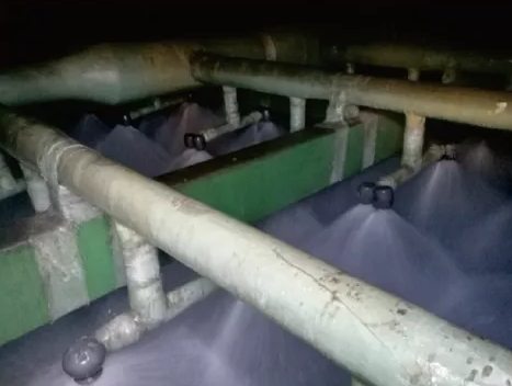 工艺水系统调试水泵运行正常时应注意调节各水泵出口母管压力,出口压力应满足系统需要,压力不宜过高也不宜过低,特别是除雾器冲洗水压力,压力低不利于除雾器冲洗,压力过高会损坏除雾器冲洗管线,因此应将水泵出口压力调节至设计范围。调试时应注意对管路进行冲洗,应特别注意各仪表冲洗水。除雾器冲洗水调试时应注意检查冲洗效果,如图1所示,并对冲洗顺控进行试验,确保时间满足设计需要。