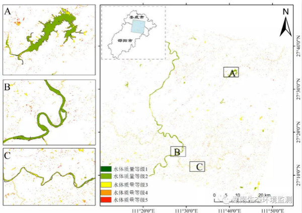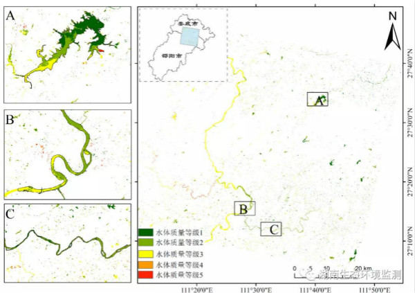 图1和图2湖南省部分地区(邵阳-娄底)黑臭水体遥感监测结果。A、B、C分别为白马水库、资水干流部分河段、邵水部分河段的水体质量等级分布地图,通过水体反射率的计算,为后续野外采样测量的基础。