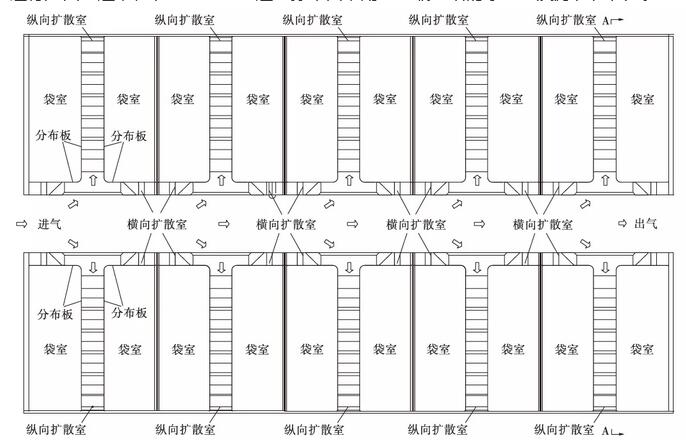 进气口气体分布板把扩散室和袋室隔开,扩散室有横向区和纵向区,纵向扩散室又把一个袋室分成两部分,增加扩散空间,有利于气体均匀分布。烟气从进气口经过烟道,侧进气到袋室的纵、横向扩散室。气流均布系统下部设有挡风板和分散板,使含尘气体中较粗颗粒的粉尘受阻挡碰撞直接沉降到灰斗内部,其他含尘气体从孔板向上运动进入袋室上部,再从上部进入袋室,从滤袋中部靠下部位均匀、缓慢地向过滤袋区扩散,达到烟气均布的目的。