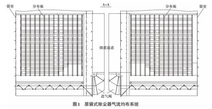 原袋式除尘器采用侧进气方式,并有从进气烟道侧壁到袋室向外纵向扩散的通道,有利于烟气气体的均匀扩散,同时避免烟气气体直接冲刷滤袋。原袋式除尘器的气流均布系统如图1所示。