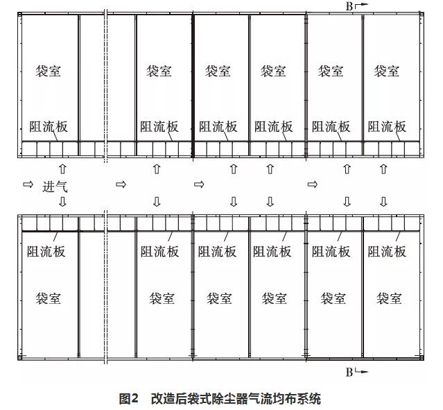 为了合理优化结构和减少改造成本,我们决定保留原袋式除尘器的基础、输灰系统、灰斗和壳体、气路系统的气源处理元件、储气罐和差压系统,拆除原袋式除尘器壳体内部的气流均布系统,设计新的进气均布系统;袋室增高1 300 mm;每个袋室的滤袋数量由原来的224条增加到280条;采用Φ160 mm×8 300 mm的滤袋;将过滤风速降低到0.7 m/min左右。