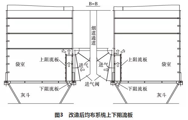 为了节约成本,缩短工期,有效利用原设备空间尽量布置足够多的滤袋,需要拆除原气流均布系统,布置新的气流均布系统(见图2),阻流板分为上阻流板和下阻流板(见图3)。改造后袋式除尘器的进气仍是侧进气方式,气流从进气阀进入,撞到上阻流板后向上流动进入袋室,有效缓解滤袋底部的冲刷,滤袋表面粉尘分布均匀;下阻流板阻挡气流灰斗进气。而灰斗进气的滤袋表面粉尘是呈自下而上逐渐减少的,底部附灰严重。