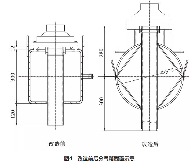 设计一个合理的分气箱是脉冲清灰系统设计的一个重要环节。根据实践经验,在脉冲喷吹后气包内压降不超过原来储存压力的30%,当脉冲阀配备大容量的气包时,脉冲喷吹效果更明显。改造后的分气箱选用的无缝钢管Φ337 mm×8 mm,比原分气箱选用的方管300 mm×300 mm×10 mm承受压力更好,方形管的缺点就是每次喷吹时壁板会发生位移,喷吹频率高时钢板会出现断裂。改造前后分气箱的截面如图4所示。