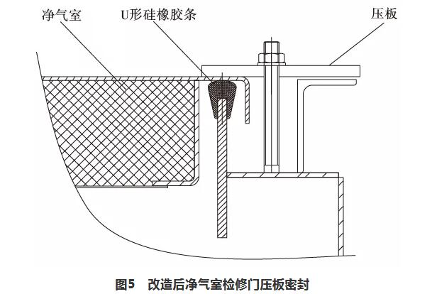净气室检修门用U形硅橡胶密封条(见图5)代替原来的橡胶海绵条,U形硅橡胶密封条密封效果好,工作温度范围从-100 ℃至350 ℃,耐氧化,绝缘性好,耐油性好,改造后检修门气密性好,漏风率低。
