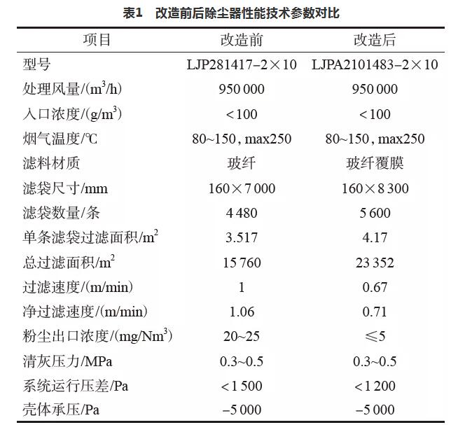 为了满足新的排放浓度标准,分别从壳体结构、喷吹系统、滤袋材质选择和清灰控制等方面对原来的窑尾袋式除尘器进行改造。改造前后的除尘器性能技术参数对比见表1。