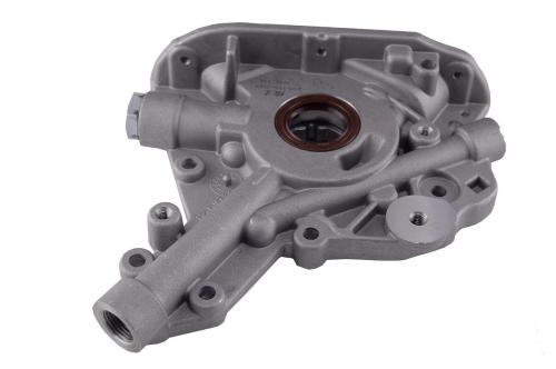 外啮合齿轮式机油泵壳体内装有一个主动齿轮和一个从动齿轮。齿轮与壳体内壁之间的很小,壳体上有进油口。工作时,齿轮旋转进油腔的容积由于轮齿向脱离啮合方向运动而增大,腔内产生一定的真空度,机油便从进油口被吸入并充满进油腔。齿轮旋转时把齿间所存的机油带至出油腔内。由于出油腔一侧轮齿进入啮合,出油腔容积减小,油压升高,机油便经出油口被送到发动机油道中。机油泵通常由上的螺旋齿轮或曲轴前端驱动。在发动机工作时,机油泵不断工作,从而保证机油在润滑油路中不断循环。