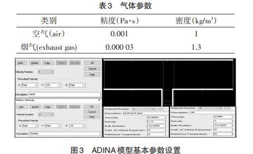边界条件:图3中粗线条设置为墙壁条件,其他区域介质可以进出;介质参数:如表3所示(参数温度环境为30℃);时间条件:共9 s;负载条件:图3中箭头所示。模 型1在吸尘口处添加除尘风速10 m/s,在两侧通道的右侧界面添加横风(Wind)风速条件2.5 m/s;模型2 只在吸尘口处添加除尘风速(Suction)10 m/s。