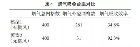 表4可以更直观地看出有无横风情况下烟气的吸收效率,无横风时可以高达92.3%。分析表明,横风的存在会大大降低除尘效率。要想提高除尘效果,必须避免横风的存在。