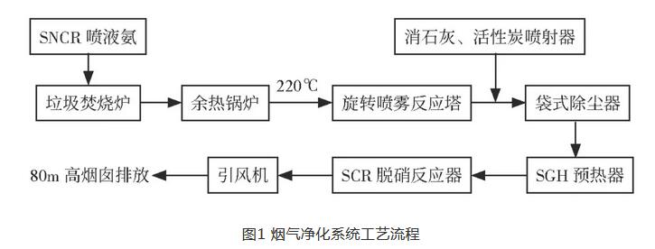 烟气处理工艺采用“SNCR+半干法(旋转喷雾反应塔)+活性炭喷射+消石灰干粉喷射+布袋除尘+SCR”的组合式工艺,烟气排放标准全面满足《生活垃圾焚烧污染控制标准》(GB 18485—2014)及欧盟2010/75/EC标准。工艺流程见图1。