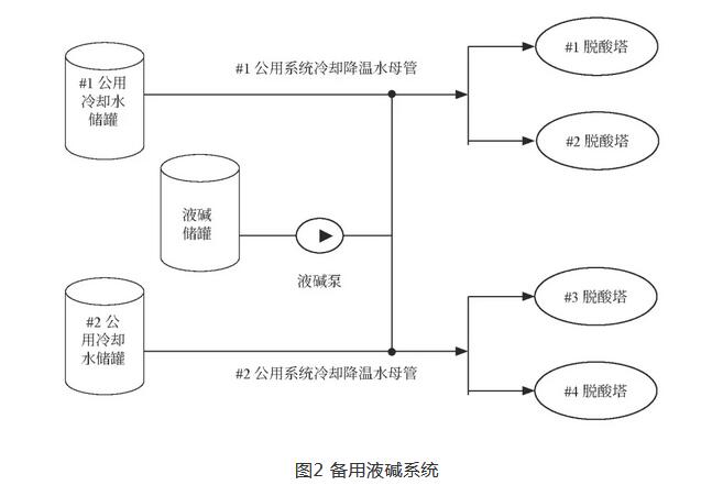 液碱母管分别与#1公用系统冷却降温水母管、#2公用系统冷却降温水母管相连,液碱输送管路与冷却降温系统管道母管共用一套输送管路,系统流量及压力的调节可利用原有系统阀门进行控制。系统如图2备用液碱系统。