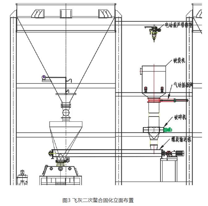 系统流程:吨袋→电动葫芦→破袋仓→破碎机→混合搅拌机→打包机→转运。飞灰二次螯合固化立面布置见图3。