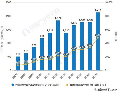 2007-2017年我国建制镇污水处理厂数量及处理能力统计情况