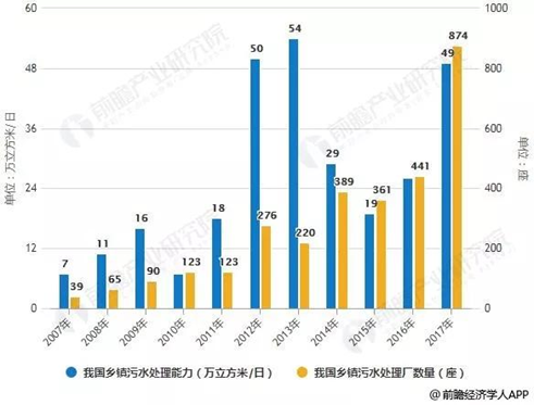 2007-2017年我国乡镇污水处理厂数量及处理能力统计情况