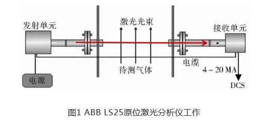 大坝电厂7、8号炉氨逃逸在线监测系统采用ABB LS25原位激光分析仪,它由激光发射单元和接收单元构成,分别安装在SCR系统出口烟道的对角侧,激光发射端发射出特定波长的激光,烟气中的NH3吸收激光形成吸收光谱,在接收端对监测到的光信号进行分析,然后通过光电转换器将分析结果传输至发送端的PDA,从而得出所测气体的浓度转换为4~20mA电流信号送至PLC,最终到达DCS进行监视,如图1所示。