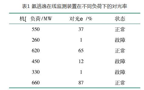 7号机组投产运行期间,氨逃逸在线监测装置频繁报警显示对光率低故障,氨逃逸检测装置在不同负荷下的对光率见表1。