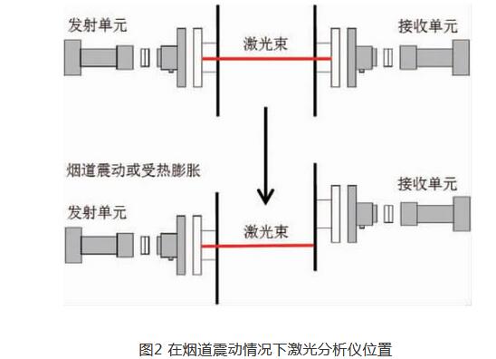 根据《ABB AO2000-LS25激光分析仪操作手册》的要求,在仪器调节对准后,所允许的激光器和接收器中轴之间由于温度或震动影响而产生的对光率大于15%,最大角度偏差小于0.3°才不会对测量产生影响。在机组运行期间,当锅炉在尾部声波吹灰和负荷变化时,测量装置都会因为烟道震动或受热膨胀导致发射和接收单元不在一条中轴线上而造成数据离线,如图2所示。