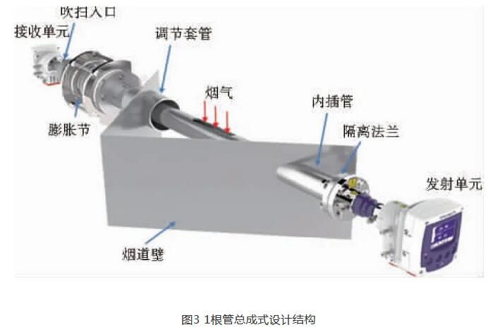 发射单元和接收单元使用1根管总成式连接,改装后的激光分析仪的发射单元和接收单元使用1根内插管进行连接,在接收端安装膨胀节、调节套管,即使在烟道受热膨胀时,该端膨胀节通过伸缩作为烟道受热膨胀的补偿,有效解决了烟道受热膨胀带来的激光仪对光难的问题,并增加反吹气孔,测量时两端圆孔封闭,当反吹气源压力过低,内插管中间形成积灰时,只要打开两端圆孔的封盖,利用测点烟道与大气形成的负压把积灰吹走。方案优点是测量温度为实时烟温,烟气成分和组分浓度不变。缺点是改造过程耗时长。