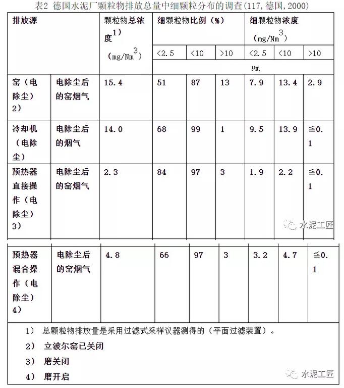 欧盟在过去的几年里,已发展到采用不同的测量方法和间单的装置与计算模型相结合来确定和区分细颗粒物粒径及其分布,例如,在粉尘总排放量的基础上测量烟气流。来自德国的调查表明,总颗粒物排放的主要部分是以细颗粒物出现的,不受废气的总颗粒物浓度的影响。通过电除尘器排放的,有90%的粉尘是小于10微米(PM10)和50%的小于2.5微米(PM2.5)的细颗粒物,具体实例见水泥工业的统计表2。