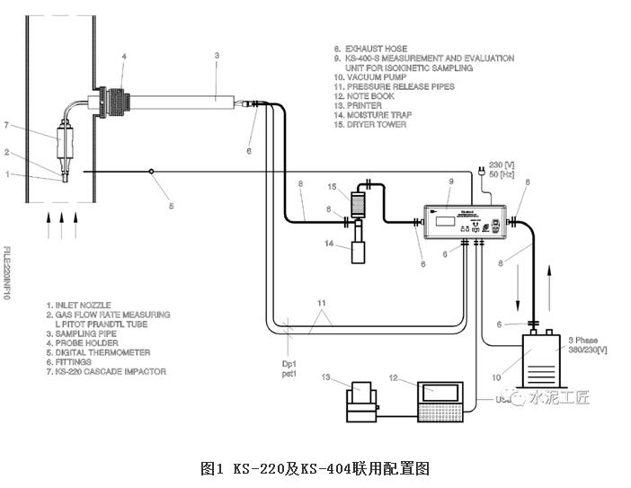 KS-220 型烟道气颗粒多级采样仪是符合最新的环境标准—ISO-EN909 的颗粒采样仪,它采用最新的流体机械的形状设计,在增加冲击效果的同时以及减少仪器尺寸,腔室内部采用三级两板的构造,在设计流量下三级的切割粒径分别为PM10、PM2.5及PM1.0,一次采样能得到六个样品,同一级的两个样品可以取平均值。KS-220 可配置不同尺寸的等速采样头,非常适合应用于不同燃烧源排放颗粒物的理化特征分析。KS-220 通常与KS-404 自动采样仪联用,配置图如图1所示。KS-404自动采样仪将自动测定采样流量及温度、计算并控制等速采样条件、控制采样泵、输出数据等。