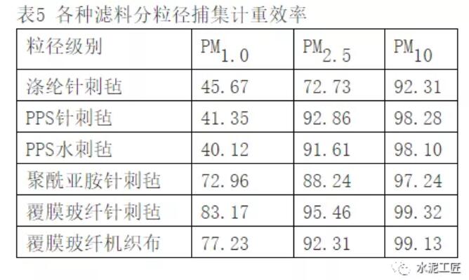 最近,国家环保部进一步进行水泥行多污染协同控制治理的要求下,各大学,研究机构进行了实验室的理论研究。如东北大学滤料检测中心,通过实验手段,就目前市场上几种常用的袋收尘器的滤料,对超细颗粒物的过滤性能进行了测试,结果,见表5。