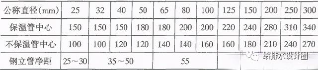 注:(1)钢立管净距指给水、采暖立管外壁与墙、柱的距离。(2)表中管中心与墙、柱的安装距离使用于水平干管的安装