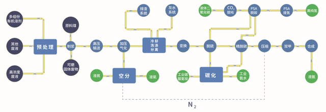 绍兴凤登环保有限公司开发的水煤浆气化及高温融熔协同处置技术,以工业有机固废、废液等作为原料替代煤和水,年节约标煤约25000吨,节水约31000吨。2019年资源化生产合格的高纯氢气(氢能源)1181.16万m3、氢气9.6万瓶、工业碳酸氢铵5.44万吨、工业氨水6.16万吨、液氨1.86万吨、甲醇0.32万吨、蒸汽4.9万吨等产品,充分利用了有机类废物中的碳、氢元素,实现了危险废物的高附加值资源化利用(图4)。