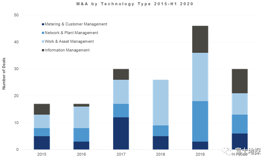 图1. 各年细分市场的份额占比,可以看到2020年管网资产管理下降明显,表计&用户管理市场有了逐步的增长