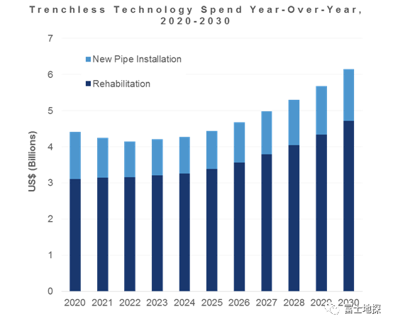 8. 解决老化的水务基础设施仍然是供水部门面临的最紧迫问题之一。水司将转向其他解决方案来处理基础设施的老旧问题。预计未来投资会优先考虑这些老化资产的修复,并有望引入更先进的资产管理,如管网健康的预测分析。如图2,非开挖技术就是很好的例子,特别是在城市地区。它们为市政当局提供了更短的工期,大大减少地表的破坏,从而降低了总体项目成本。Bluefield研究院预测,未来十年,非开挖技术的市场总量将超过525亿美元。这笔支出的大部分(76%)将集中在地下公用设施资产的修复上。