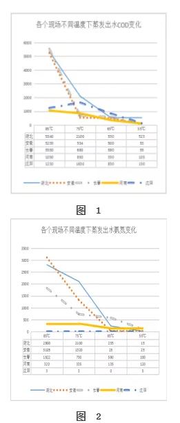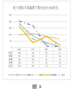 从上面的数据可以看出,随着蒸发温度降低,曲线都成下降趋势,尤其是在75-85摄氏度之间下降较为明显。后期温度下降至最低点。经过计算,在温度为85℃(对应压力-0.043MPa)蒸发时,湖北、安徽等地COD、氨氮、盐分去除率在都在约90%左右,而在55℃(对应压力-0.085MPa)蒸发时去除率COD去除率基本在99%左右,氨氮去除率基本在96%-99%左右,盐分去除率也在99%左右,所以温度越低COD、氨氮等的去除率越低去除率越高。但在工程生产中,蒸发温度过低会给工厂冷却系统带来很大压力。所以一般最低温度在55摄氏度左右。