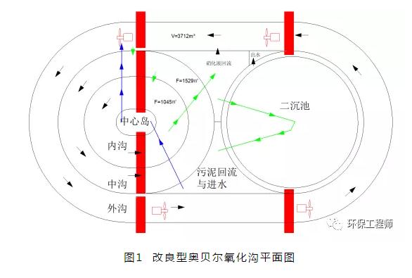 图中红色部分为表曝机,共计6台表曝机,其中外沟4台,中沟、内沟共用两台。外沟加装有4台推流器,对外沟表曝机的开停可实现外沟缺氧、好氧的转变。
