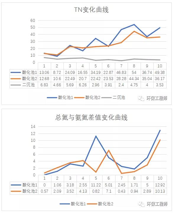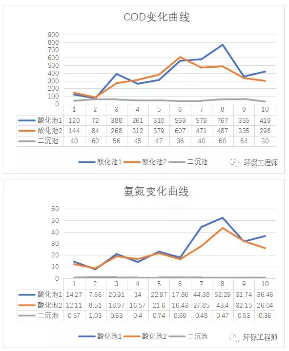 图中未列出进水氨氮,在收到进水冲击时,水解酸化池污泥会出现分解,导致酸化池的氨氮较进水口氨氮高出30-40%;