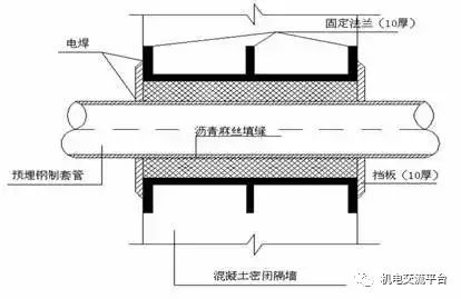(2)带密闭肋的穿墙套管。这种套管可分为两种:一种是柔性防水套管,主要运用在对防震要求较高的外墙内,另外一种是刚性防水套管,主要运用在一般外墙以及无抗力要求的密闭墙内。穿墙套管伸出墙面段大于40mm。
