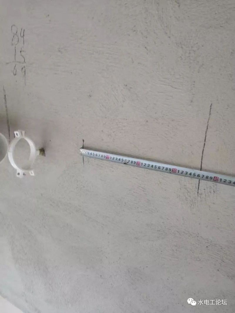 三、测量上支管的管中对着墙的位置,并画上记号(上图竖线就是管中对墙的位置)。