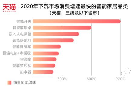 根据天猫、天猫精灵IoT及家装设计平台在2020年联合发布的《2020下沉市场智能家居消费洞察》显示,三线以下的中国家庭正在加速“智能进化”,下沉市场已超越一二线成为主力消费市场。