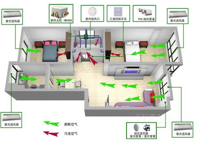 家用新风系统按标准换气次数为0.6--1次/h,但是很多业主要求配大点,风量大点效果好。其实不然,新风系统只要能保证室内换气,保证室内始终保持新鲜空气即可。机器配置的太大,风口会出现噪音,设备本身噪音也会增大。这样得不偿失。
