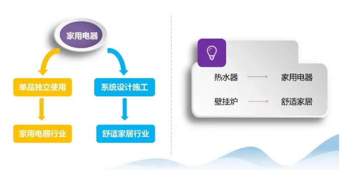 美景张华春有一个简单的总结:与家用电器的边界,取决于单品独立使用,还是系统设计施工?前者就是家用电器行业、后者就是舒适家居行业。所以热水器就是家用电器,壁挂炉就是舒适家居。与家庭装饰的边界,取决于着重视觉还是着重感觉。前者是家庭装饰行业、后者是舒适家居行业。
