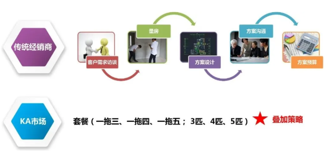 比如,近几年KA市场的中央空调销量不断提升。这是因为KA在中央空调的销售方式,不同于我们传统经销商企业。我们的售前流程是“客户需求访谈——量房——方案设计——方案沟通——方案预算”,直到成交。而KA就一招:套餐!一拖三、一拖四、一拖五,3匹、4匹、5匹,然后叠加。于是,系统品变成了单品,舒适家居行业回到了家用电器行业。
