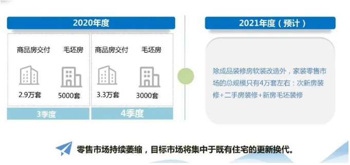 可以预见,南京2021年除去成品装修房软装改造,家装零售市场的总规模只有4万套左右,约为过去十年平均值(每年8——12万套,装饰协会估算)的一半。具体组成如下: