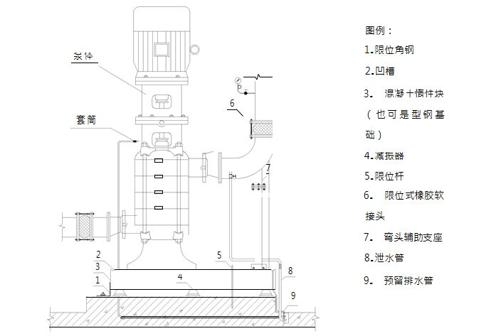 1、立式水泵底座下应设槽钢基础,扩大立式水泵基础接触面积,增加水泵平稳牢固性;槽钢基础与水泵底座螺栓刚性连接
