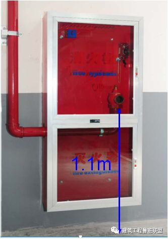 消火栓不在门轴侧,应在开启侧;消火栓口中心离地高度为1.1 米,允许偏差±10mm